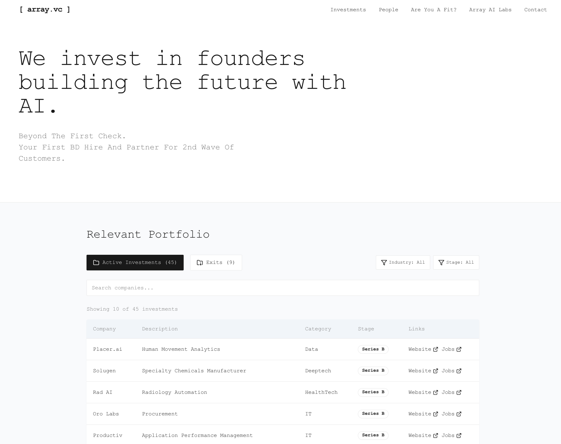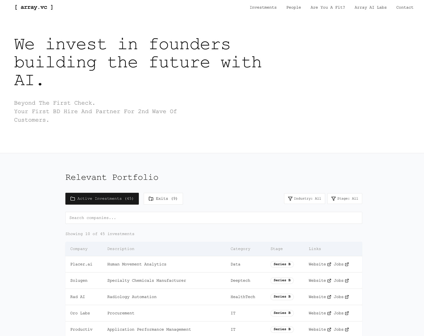 We unveiled a redesigned array.vc website and logo, vibecoded using Lovable and V0 by Vercel built by us. You can follow us on X or LinkedIn to stay on top of our experiments.