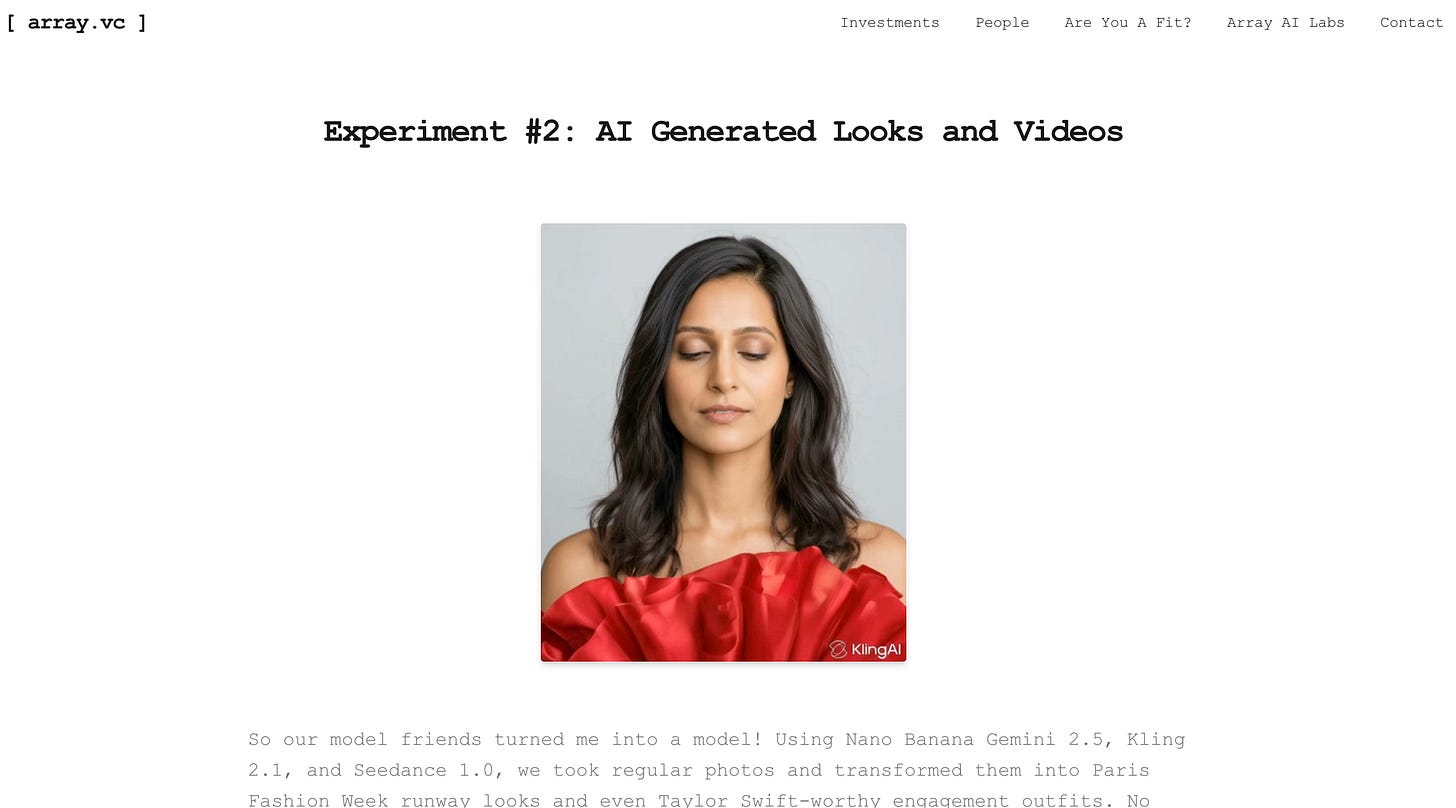 We launched Array AI Lab last quarter and have added many experiments to tell you our opinion on the latest models and companies. Excited to share this newest experiment where I got to be an AI Model with help of other model friends Nano Banana from Google Gemini 2.5 + Kling 2.1 + Seedance 1.0