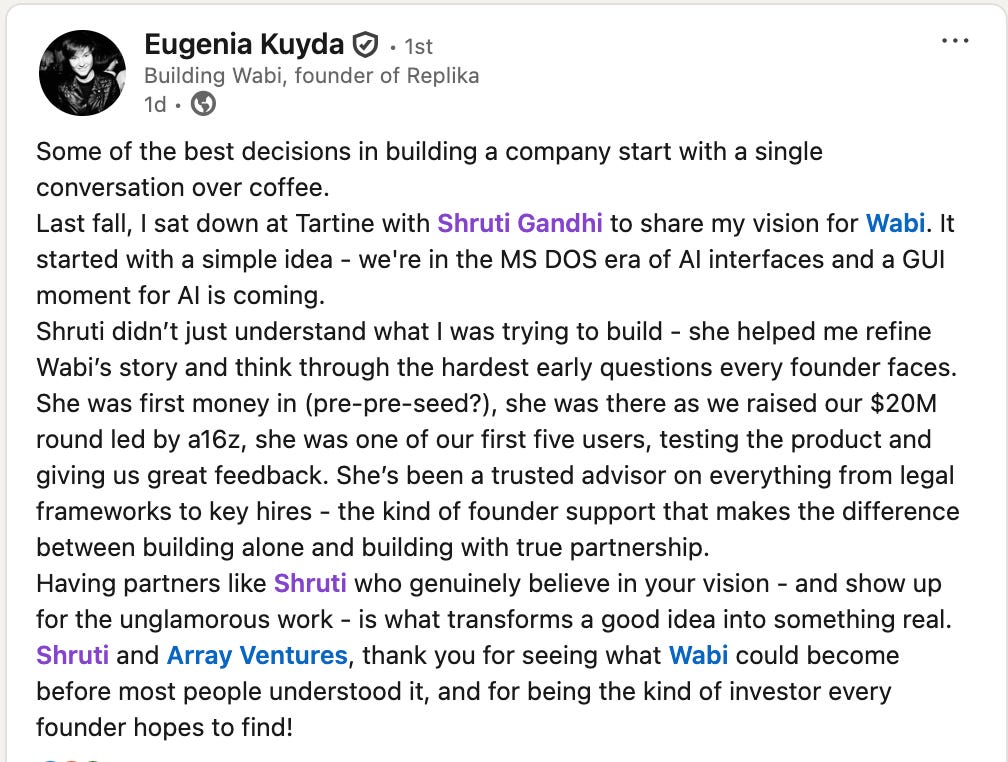 Wabi gave a shoutout to Array for being their first investor! They announced their $20m round from A16Z. Here is the launch announcement from 2 weeks ago and their X launch is here.